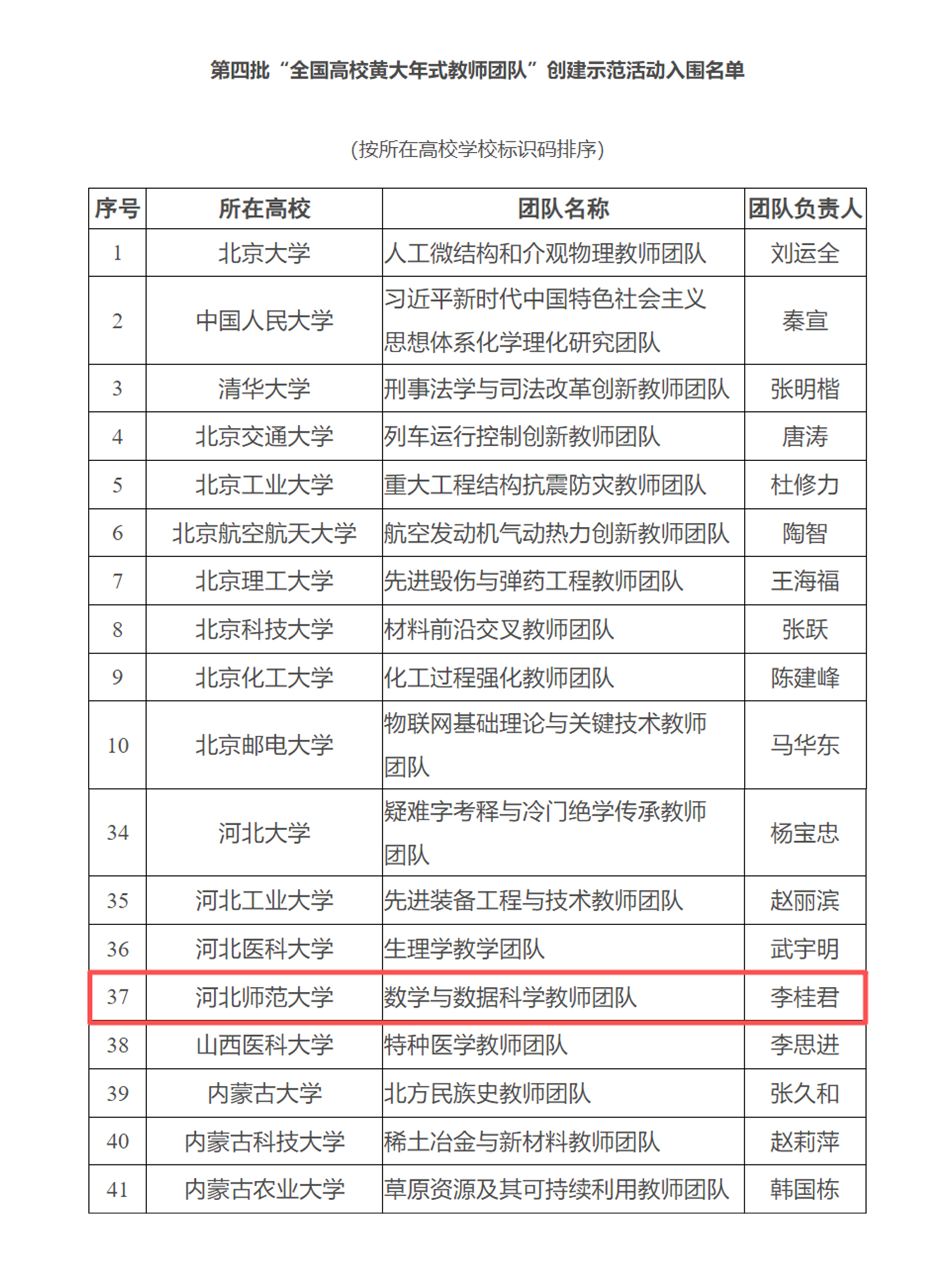 近日,教育部公布了第四批“全国高校黄大年式教师团队”创建示范活动入围名单,全国共有200个高校教师团队入选,其中河北省有4个团队。我校李桂君教授领衔的“数学与数据科学教师团队”成功入选。